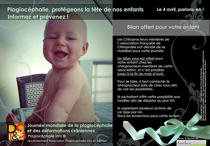 Suite à la journée mondiale de la Plagiocéphalie et des déformations crâniennes qui s’est tenue le 4 Avril 2016, les chiropracteurs membres de l’AFC (Association Française de Chiropraxie) ont décidé de se mobiliser et d’offrir un bilan à votre enfant jusqu’à la fin du mois d’avril 2016.